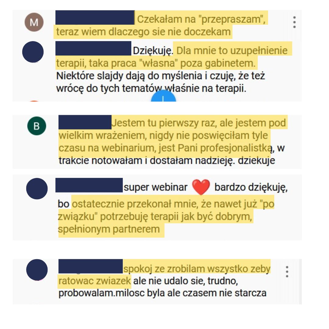 ✅ Ten webinar to ponad 3 godziny, niezwykle wartościowej wiedzy, która jest przestawiona w prosty i przystępny sposób. Podczas webinaru otrzymasz wiele wskazówek, dzięki którym będziesz w stanie jasno i bez wahania odpowiedzieć sobie na tytułowe pytanie, które Cię nurtuje: “Czy ten związek da się uratować?”